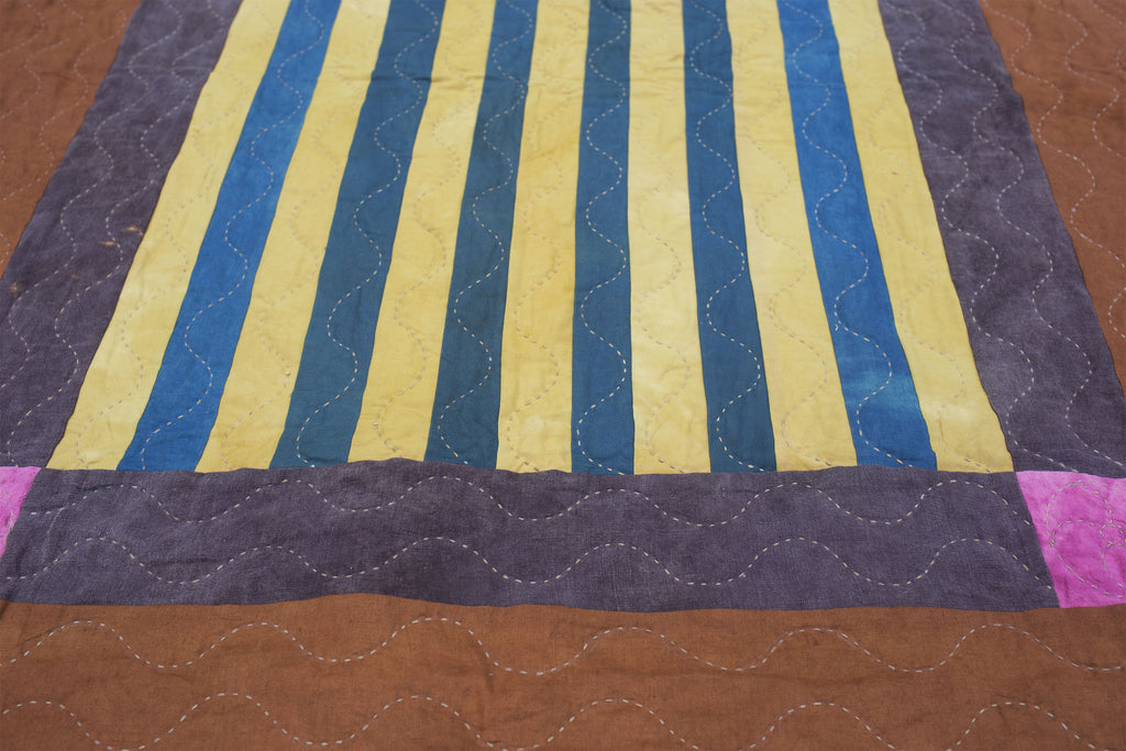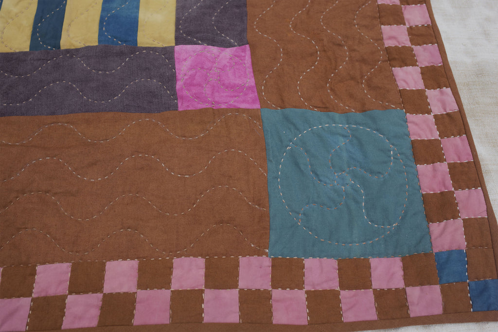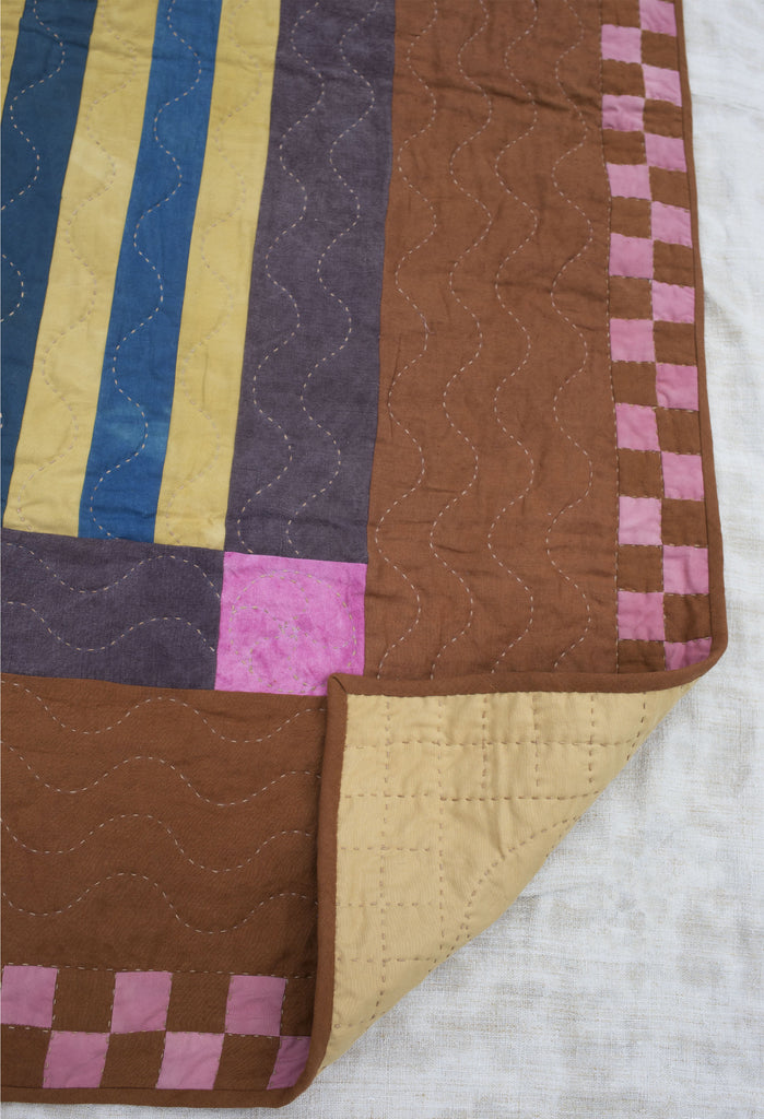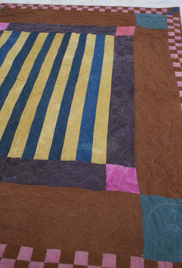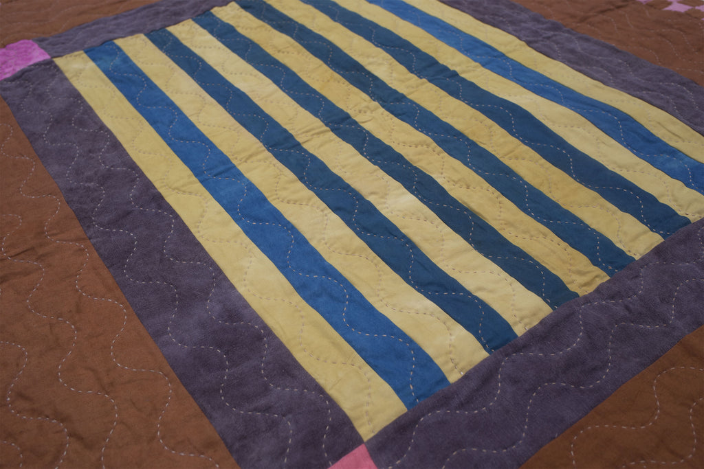 A bespoke heirloom quilt, hand-dyed with natural dyes, hand-quilted with cotton thread. Measures 44.5 inches X 52 inches.