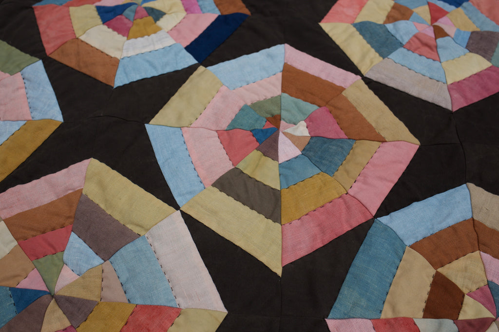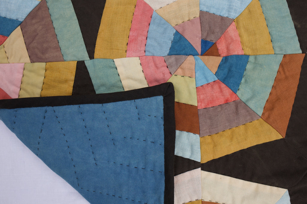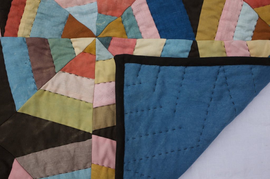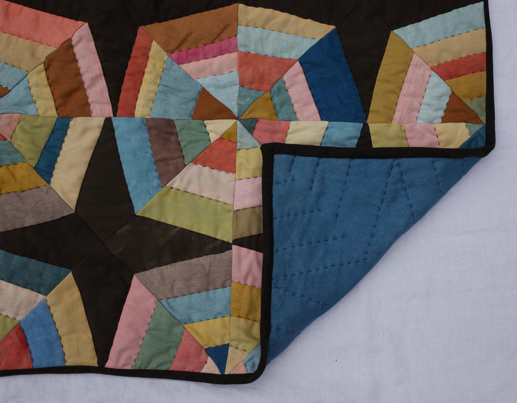 The colors of this quilt are hand-dyed with plants: logwood, indigo, madder root, osage wood, pecans, and oak gulls. Made with organic cotton and linen. Exquisitely hand-stitched in the seams of the kaleidoscope pattern, giving the quilt structure and longevity, while also creating depth and texture.