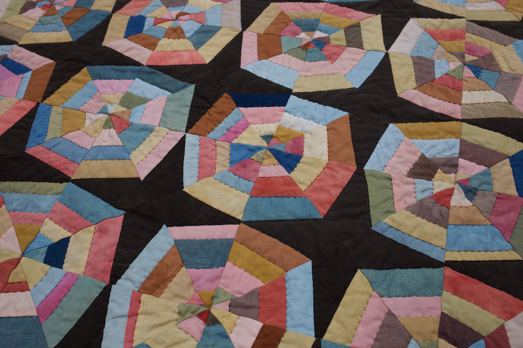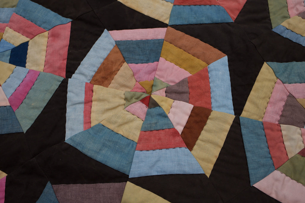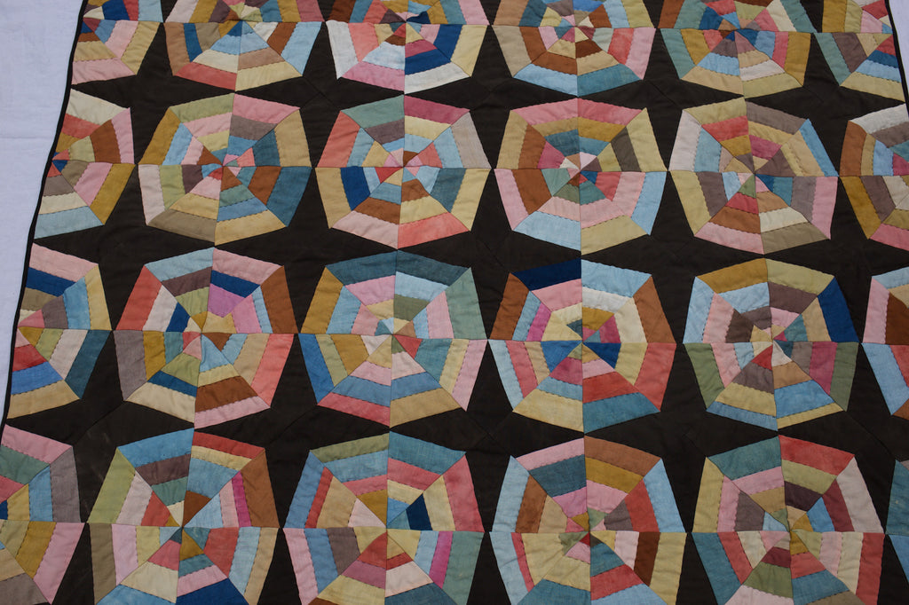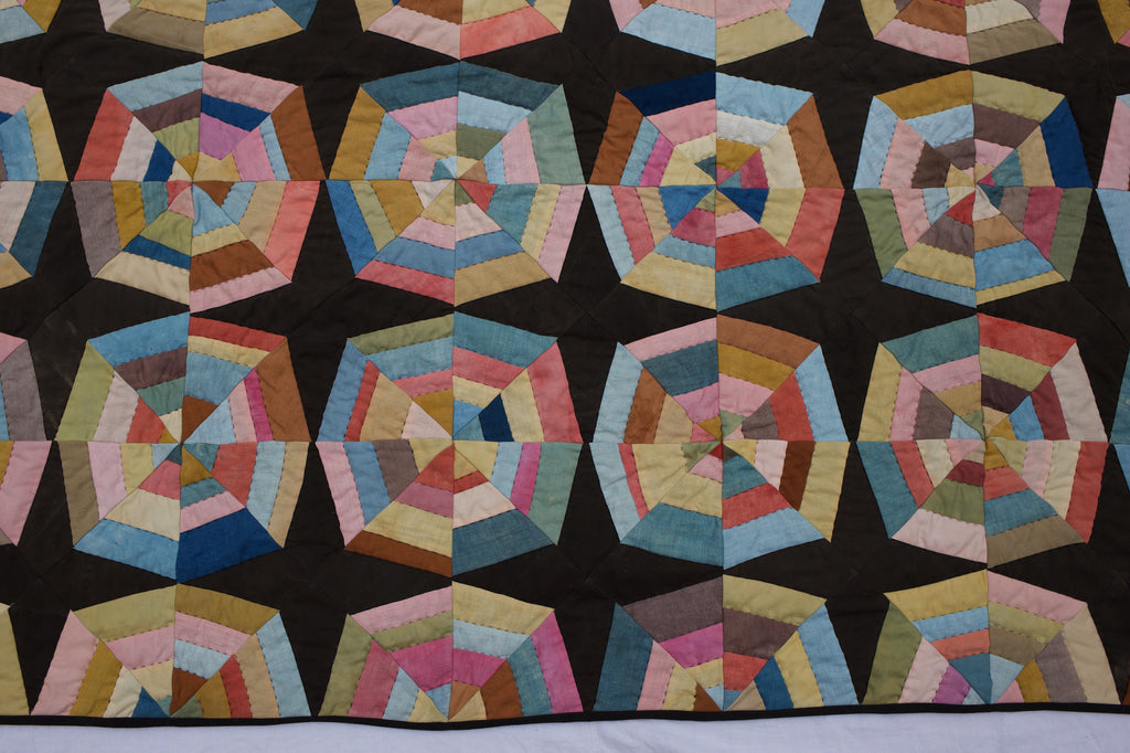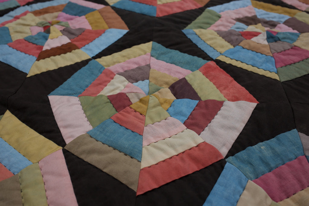 The colors of this quilt are hand-dyed with plants: logwood, indigo, madder root, osage wood, pecans, and oak gulls. Made with organic cotton and linen. Exquisitely hand-stitched in the seams of the kaleidoscope pattern, giving the quilt structure and longevity, while also creating depth and texture.