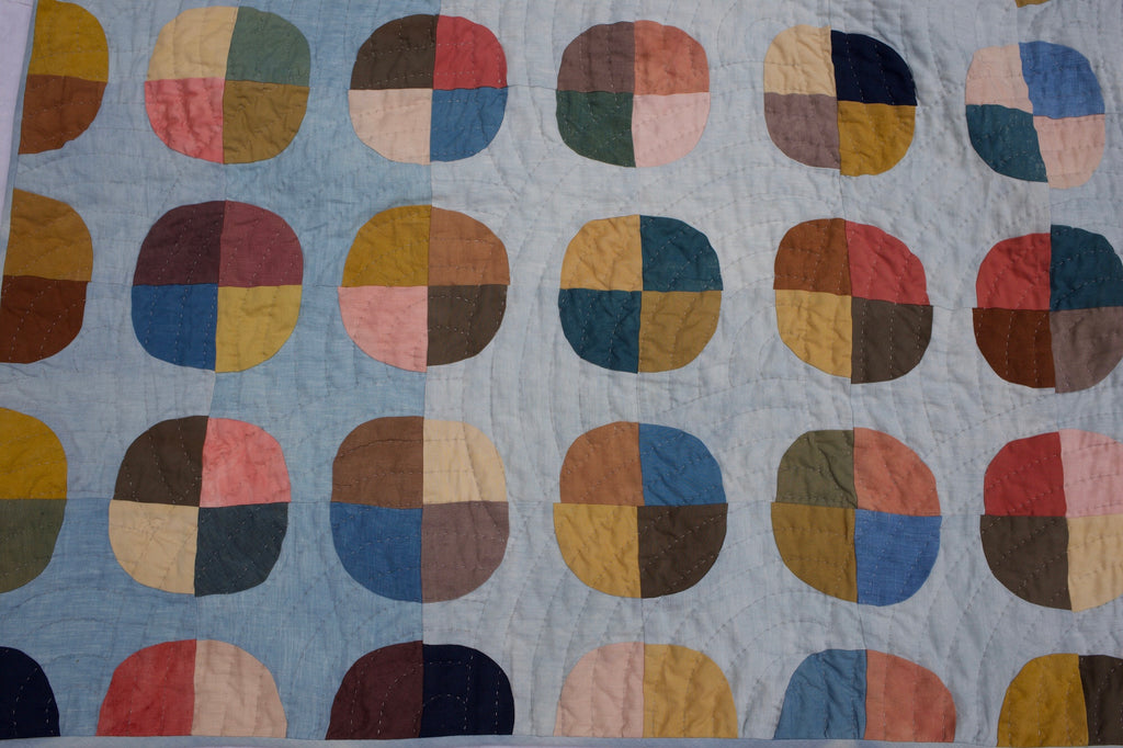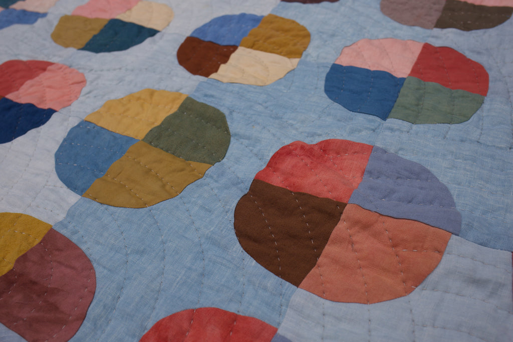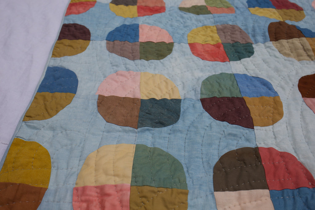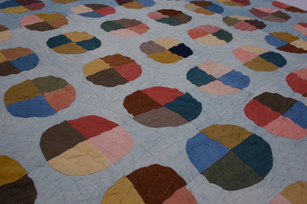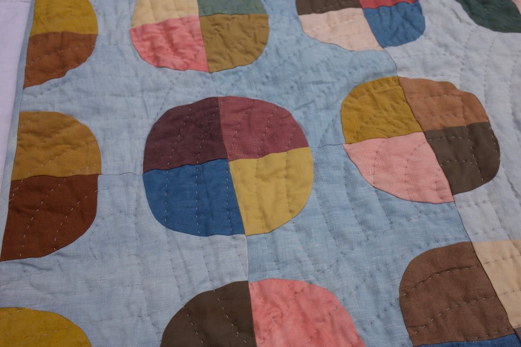 The colors of this quilt are hand-dyed with plants: indigo, madder root, osage heartwood, pecans, and oak gulls. Made with organic cotton and linen. Exquisitely hand-stitched in a repeating fan pattern, giving the quilt structure and longevity, while also creating depth and texture.