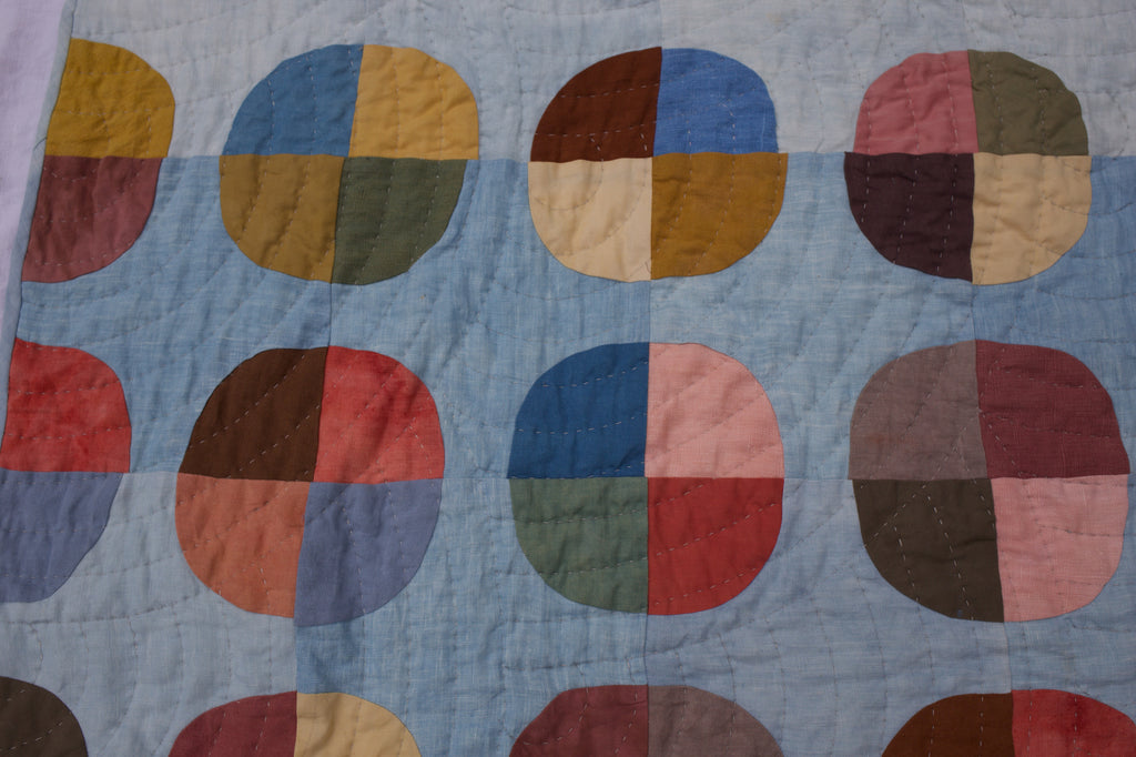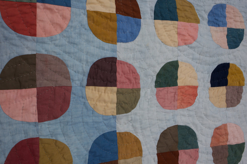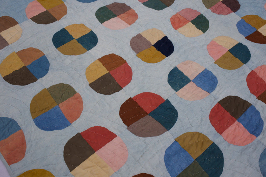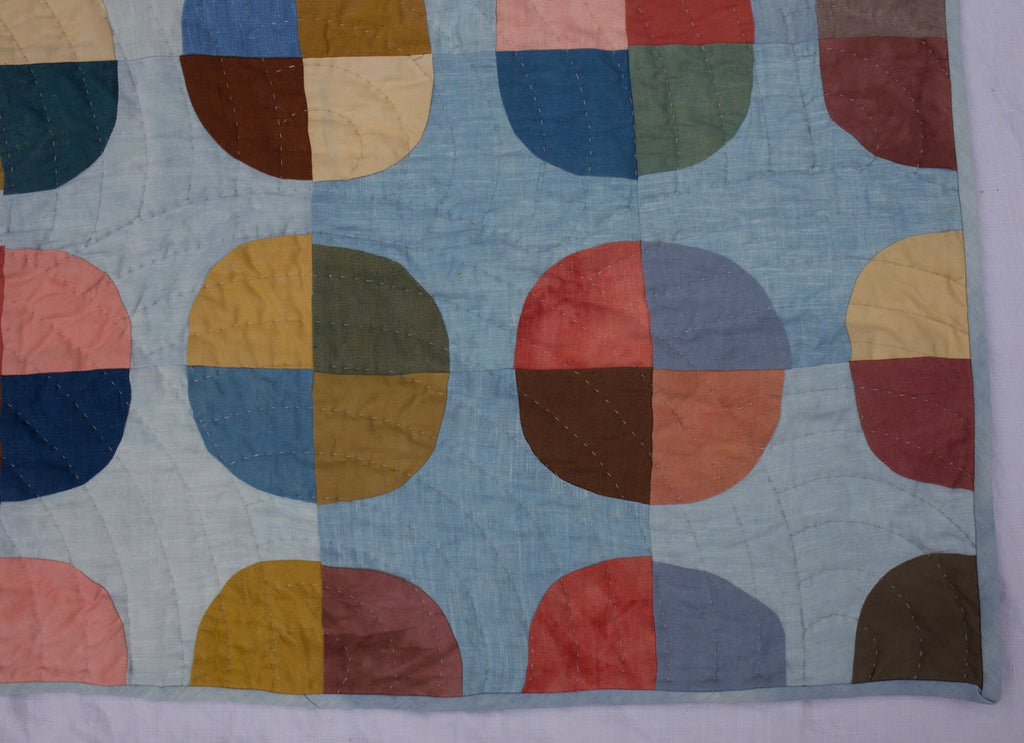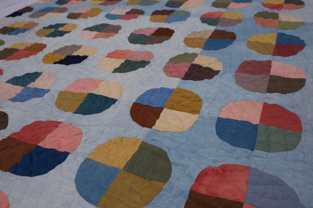 The colors of this quilt are hand-dyed with plants: indigo, madder root, osage heartwood, pecans, and oak gulls. Made with organic cotton and linen. Exquisitely hand-stitched in a repeating fan pattern, giving the quilt structure and longevity, while also creating depth and texture.