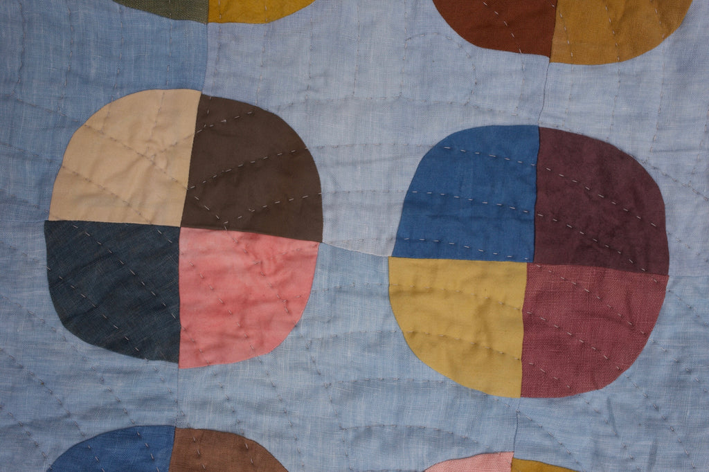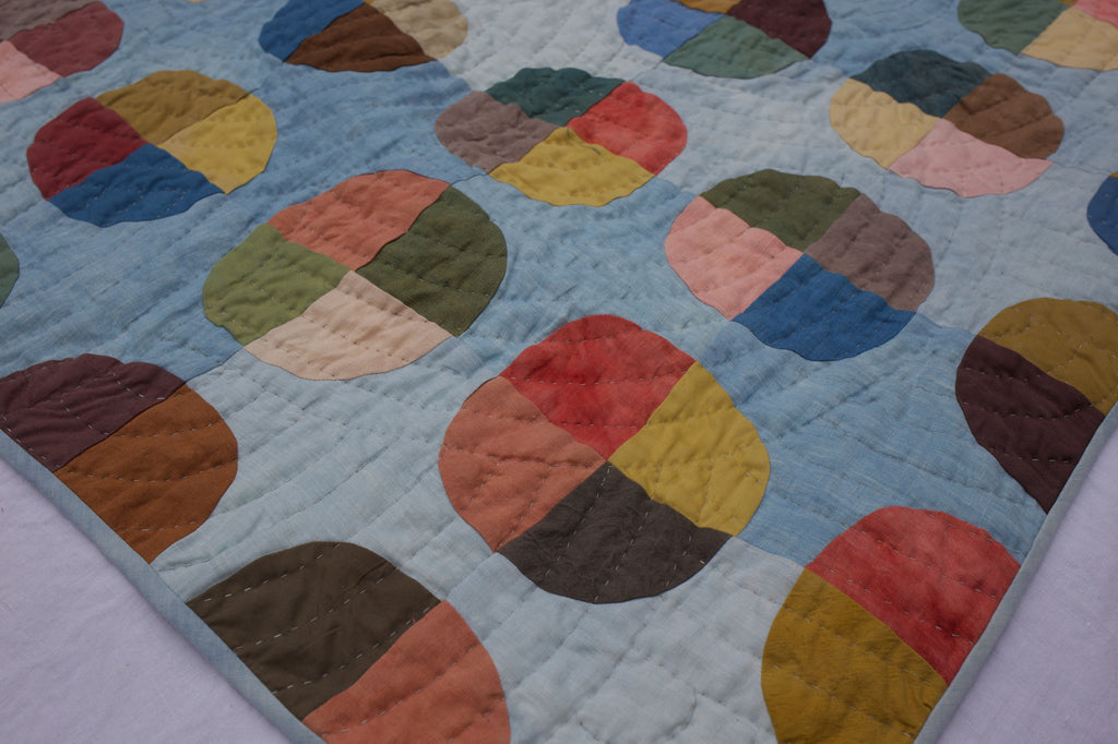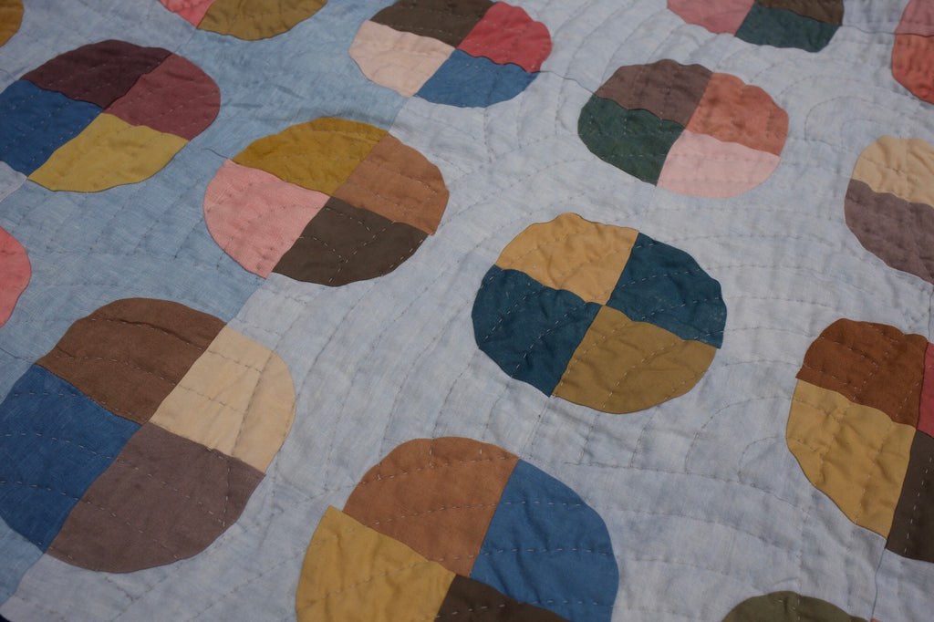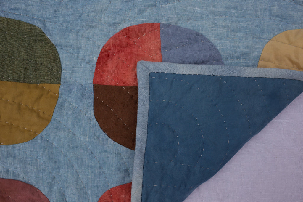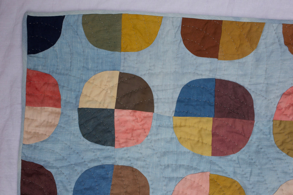 A bespoke heirloom quilt, hand-dyed with natural dyes, hand-quilted with cotton thread. Measures 51 inches X 51 inches.