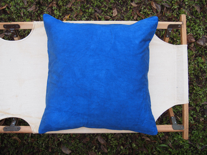 Naturally-dyed cotton and recycled denim patchwork. Trimmed with piping and invisible zipper.