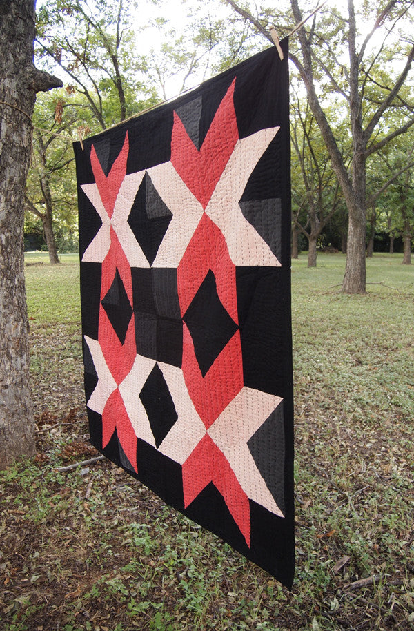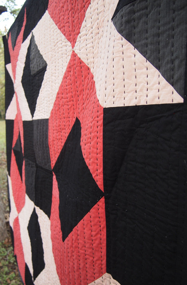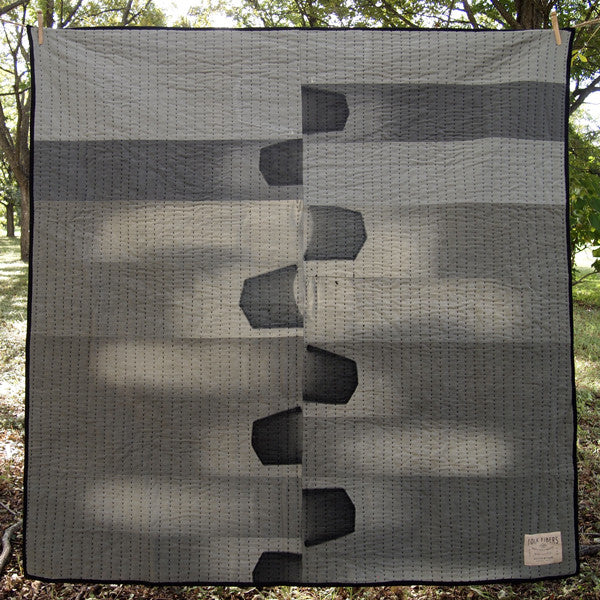 Naturally-dyed cotton and recycled denim. Hand-quilted with Japanese Sashiko thread. Padded with organic cotton batting. Trimmed with a hand-stitched double-fold binding.