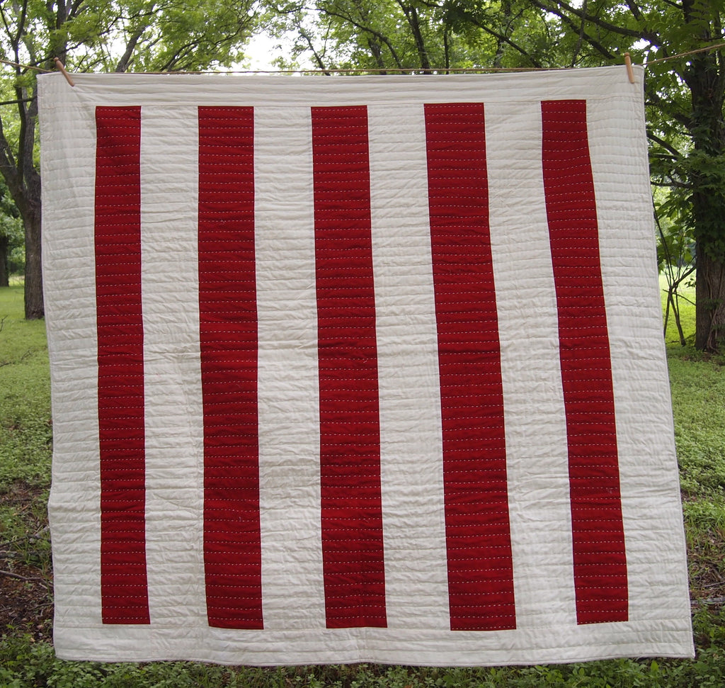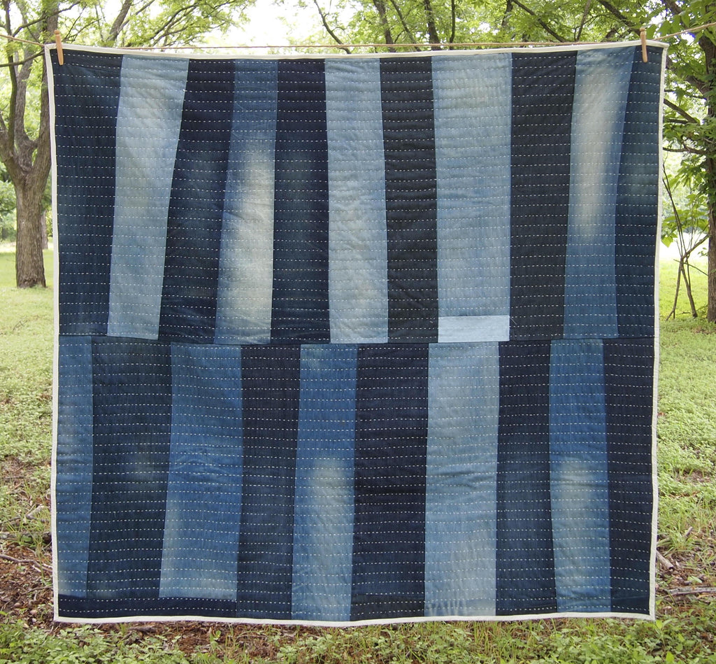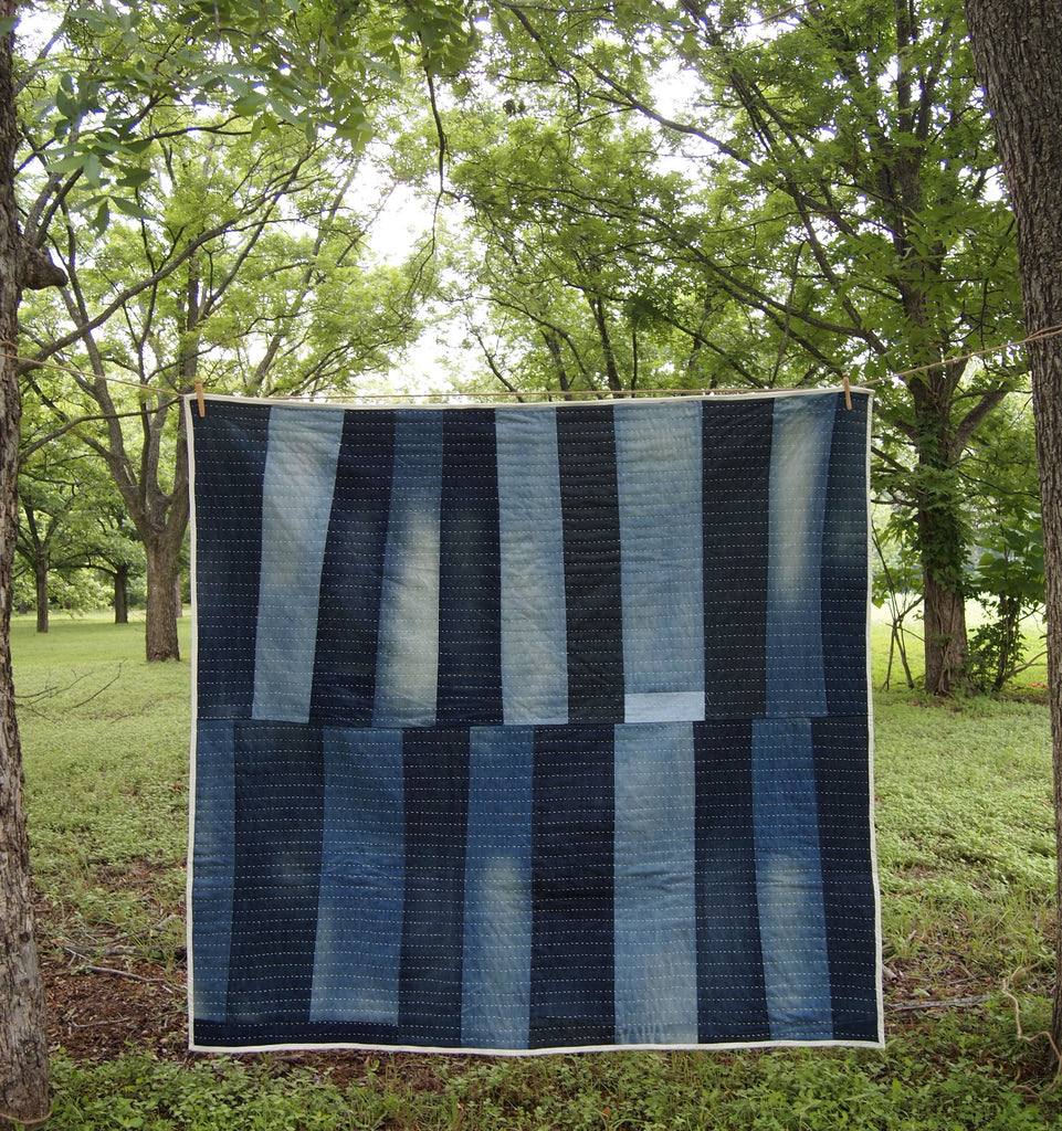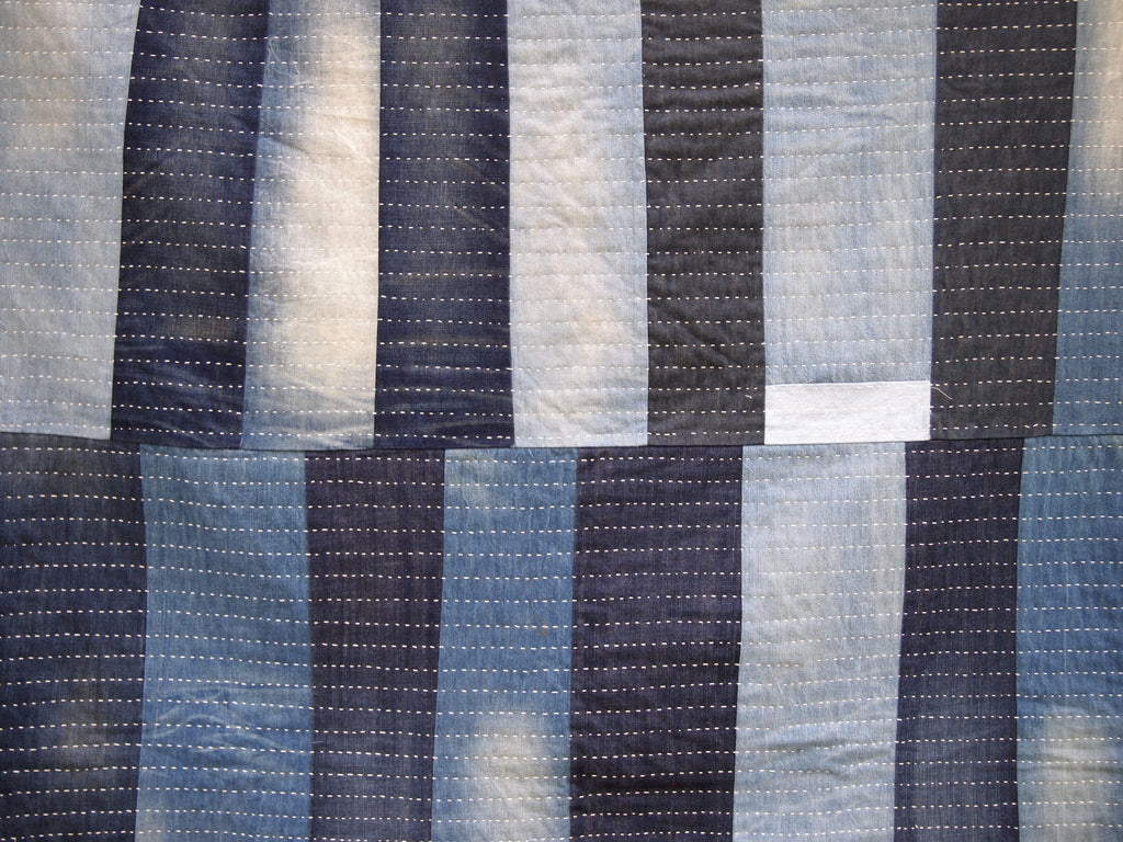 Naturally-dyed cotton and recycled denim patchwork. Hand-quilted with Japanese Sashiko thread. Padded with organic cotton batting. Trimmed with a hand-stitched double-fold binding.