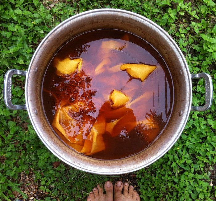 One-of-a-kind quilt made with natural dyes, hand-dyed in small batches in my backyard. The design in a traditional flying geese pattern.