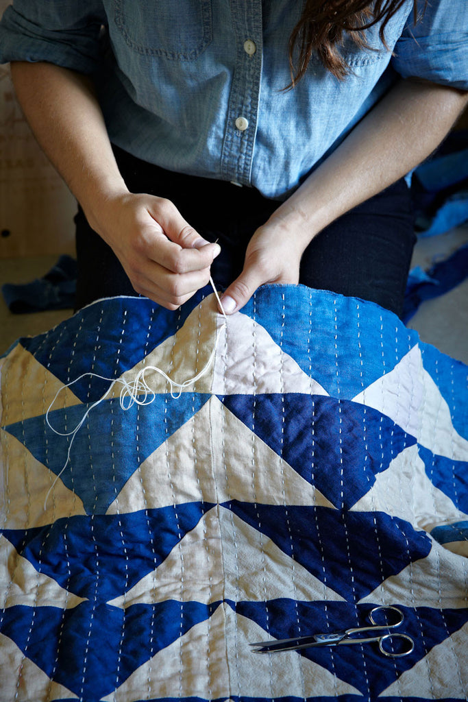 Hand-quilted with cotton Japanese Sashiko thread, padded with cotton batting, and trimmed with hand-stitched double-fold binding.