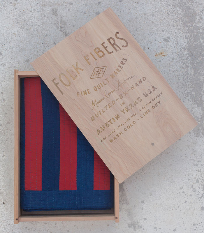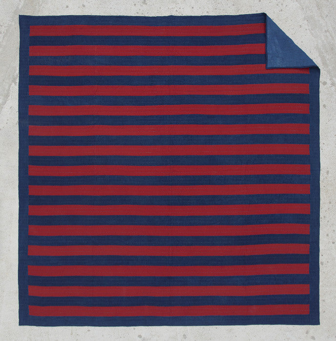 Bars of naturally dyed red cotton and indigo linen. Hand-quilted with cotton Japanese Sashiko thread. Padded with cotton batting. Trimmed with hand-stitched double-fold binding.