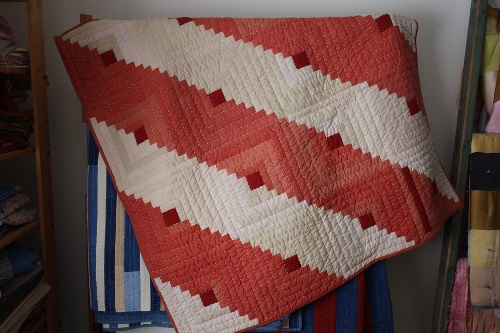 Naturally dyed Madder Log Cabin Quilt, cotton piecing, hand quilted- 44” x 44”, $750