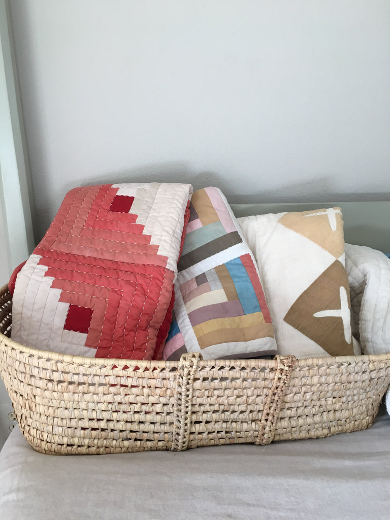 Handwoven Khadi Cotton Quilt, with indigo triangle binding, hand quilted- 45” x 45”, $750