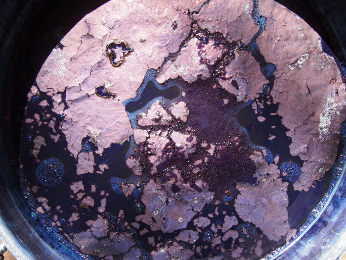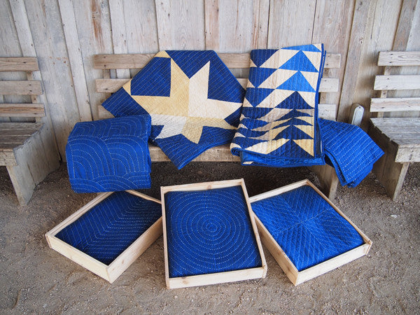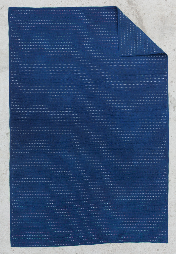 Hand-dyed linen with natural indigo, made with a whole piece of fabric for the front and back. The middle layer is padded with natural cotton batting.