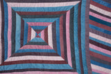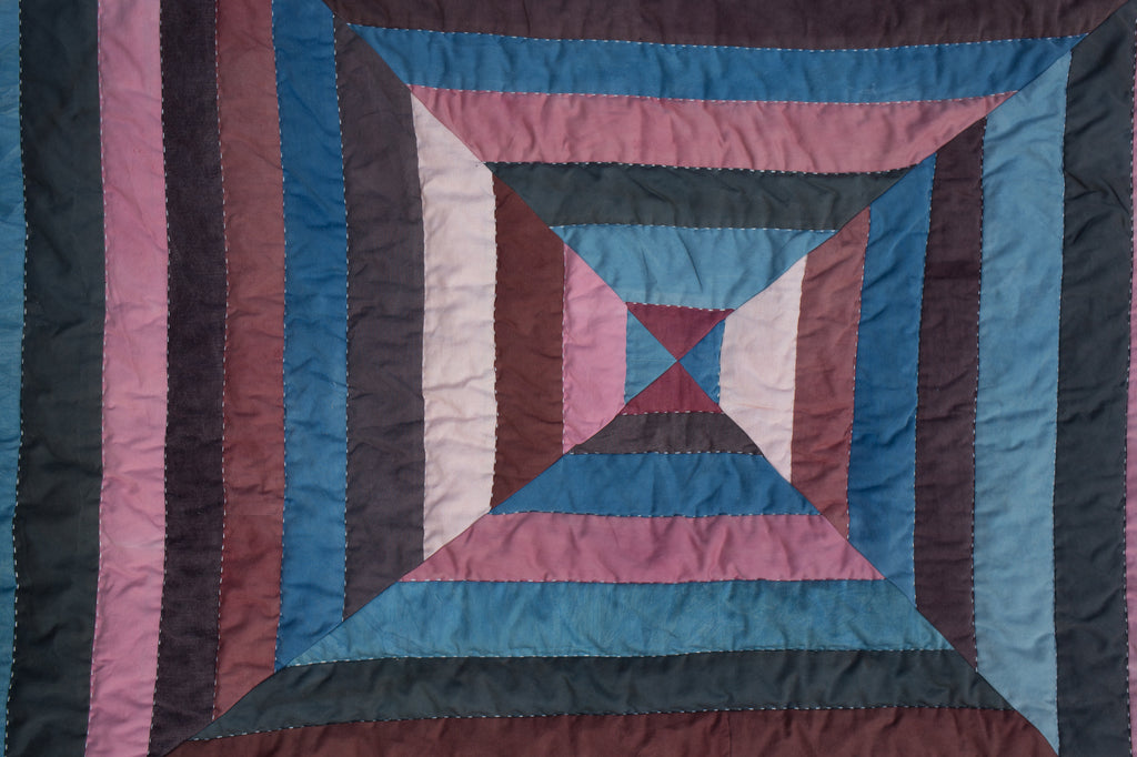 The fabrics in this quilt are cotton and linen hand-dyed with plants. The blue is made with indigo. Light pink is made with madder roots. Dark russet pink is made with brazil-wood. Light and dark purple is made with logwood. A few strips of fabric are dusty dark blue, the result of over-dyeing indigo and logwood.